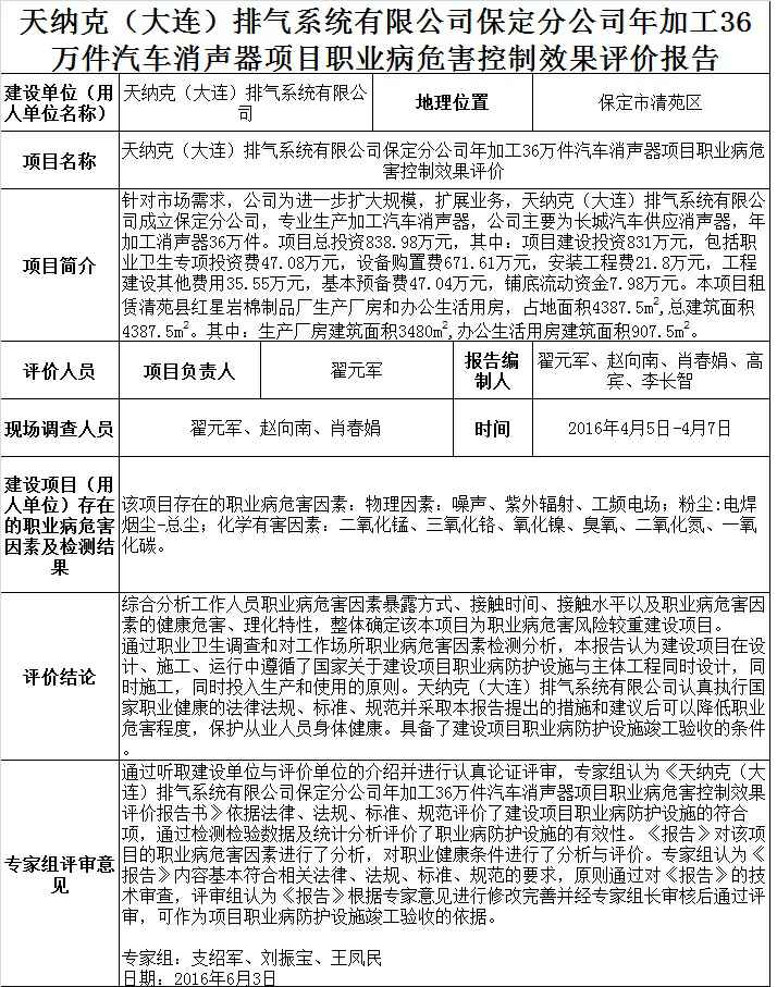天纳克(大连)排气系统有限公司保定分公司年加工36万件汽车消声器项目职业病危害控制效果评价